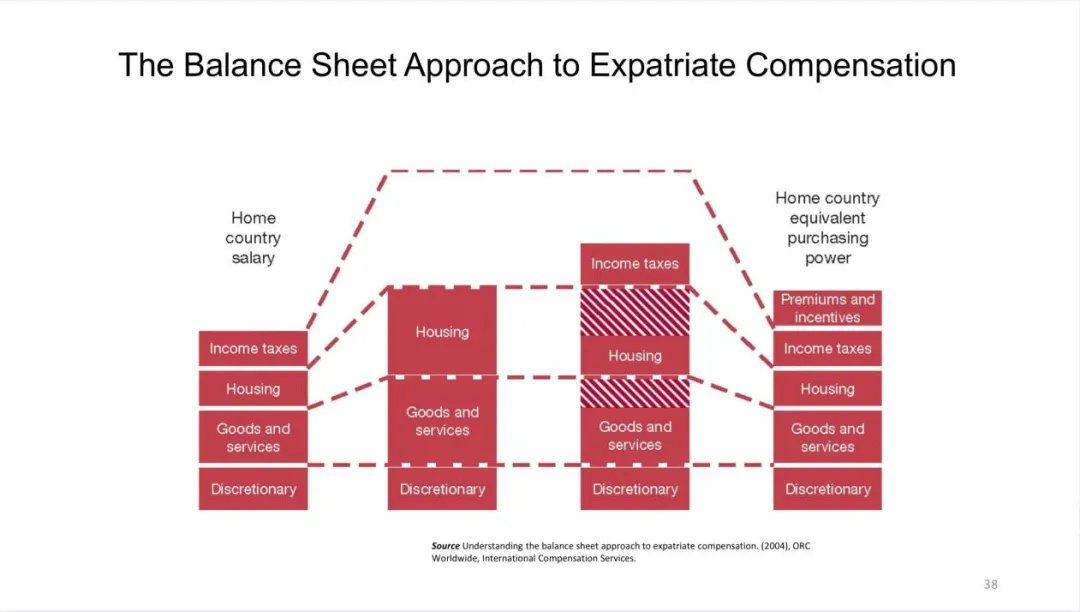 同时,通过对比芝加哥、东京、墨西哥城三地外派员工薪酬结构,展示了东京因生活成本高、合规要求严,其住房补贴、子女教育补贴显著高于其他两地。