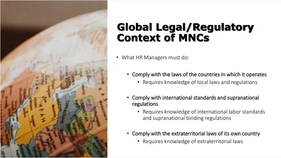 同时结合法国劳动法案例,说明其 “员工代表参与重大决策”、“法律制度完善”等特点,如何影响跨国企业在当地的人员配置与绩效管理策略,从而让学生直观理解地缘背景下法律差异对人力资源实践的约束作用。