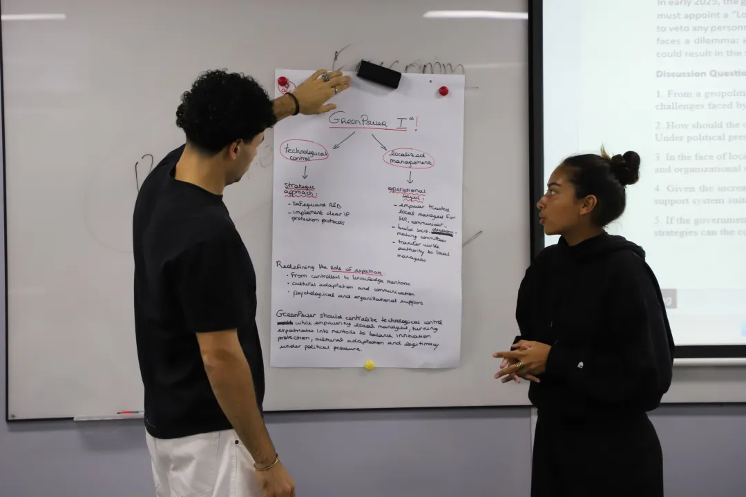 桌上的笔记本、平板铺满资料,有人翻出课程记录的“地缘政策影响清单”,有人调取“外派员工薪酬与支持框架”,还有小组直接绘“问题优先级矩阵”,从合规、人才留存、文化协同三个维度拆解解决方案。