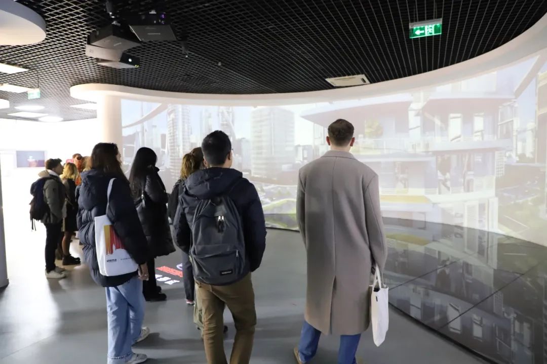 而后,同学们又继续参观展厅,驻足荧幕,观看海格客车的未来汽车行业构想短片。