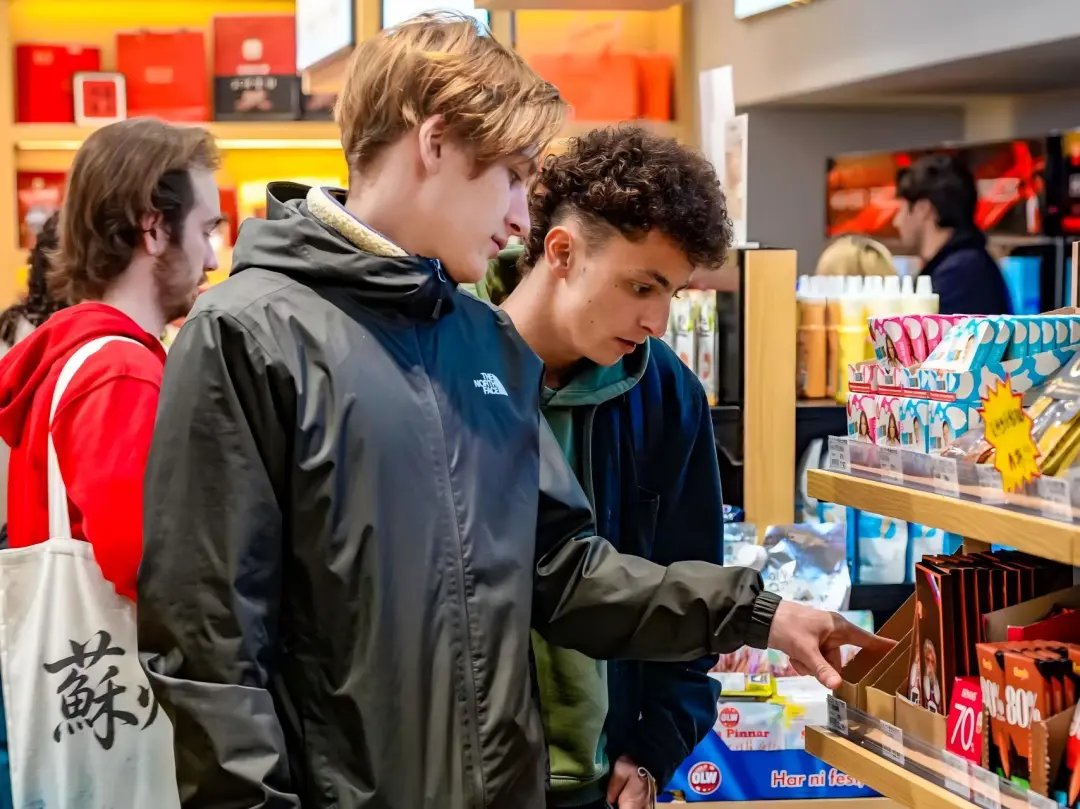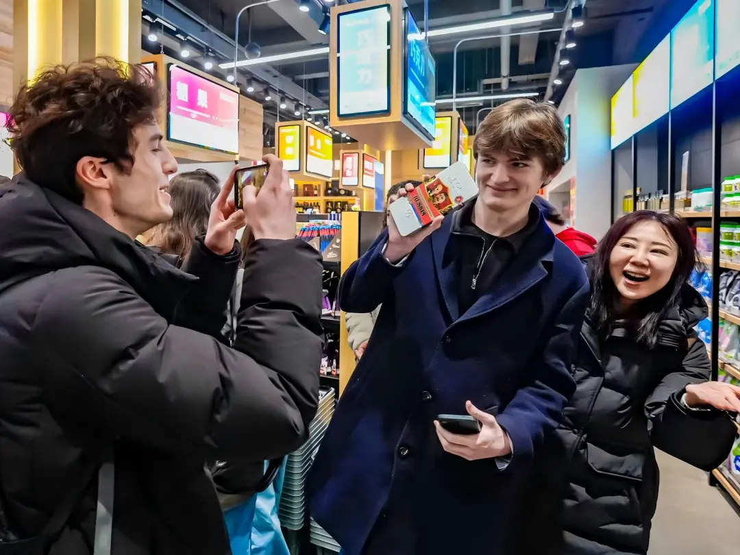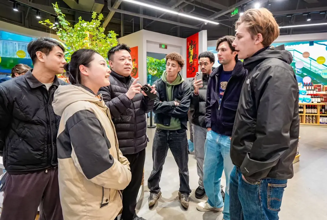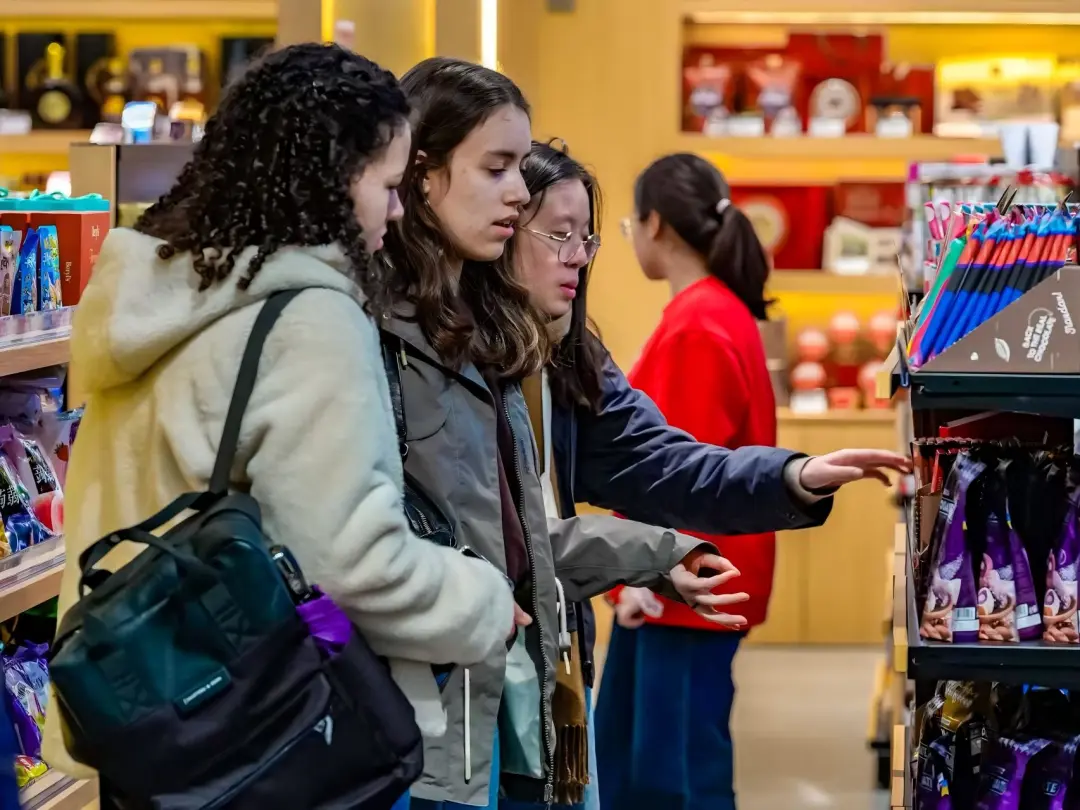 来自法国的学生们不时拿起商品仔细端详